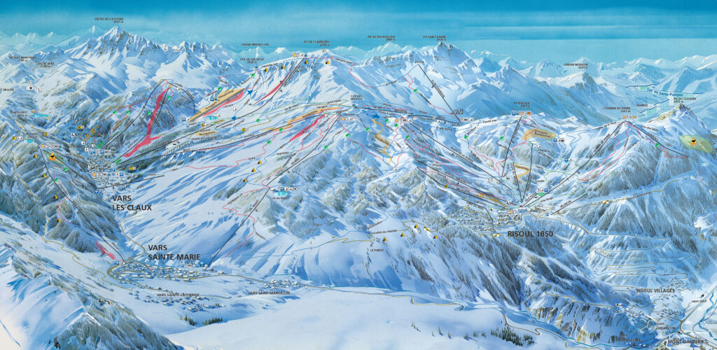 La station Vars — avec ses quatre hameaux typiques (Sainte-Marie, Saint-Marcellin, Sainte-Catherine et Les Claux) — incarne le mélange réussi entre authenticité alpine et équipements modernes. Située aux portes du massif alpin, Vars s’élève entre environ 1650 et 1850 mètres d’altitude selon les villages.